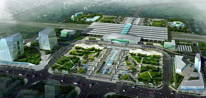 城市空间布局采用”山水之道” ,理念规划建筑造型设计, 广场景观规划采用中国书法篆,刻汉字形体组织广场结构形态.
